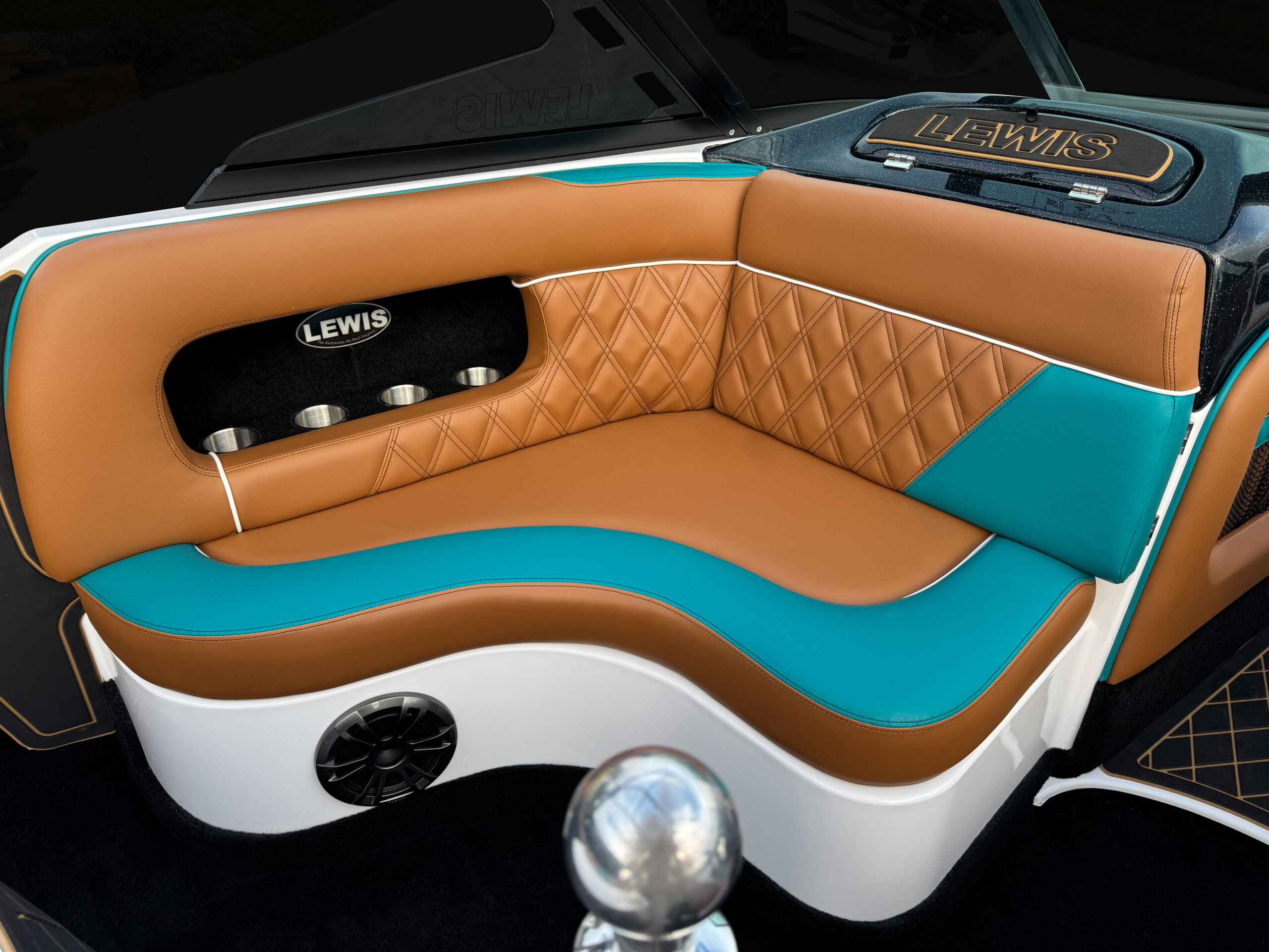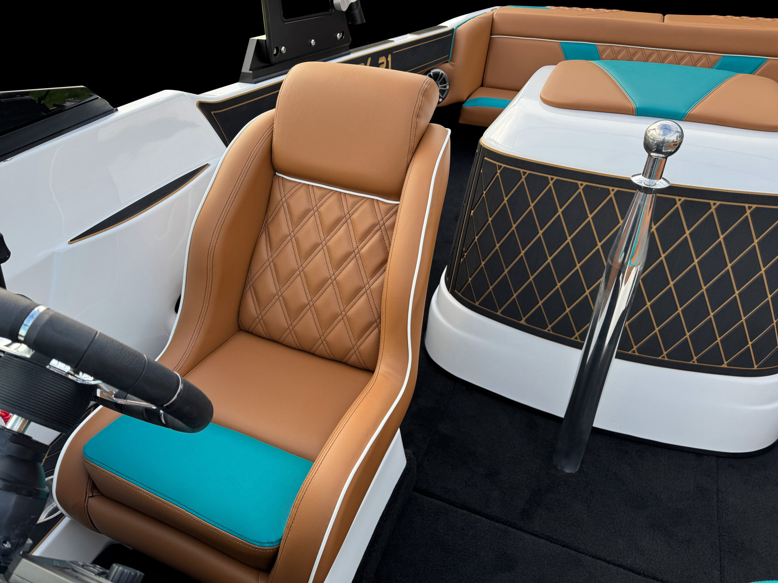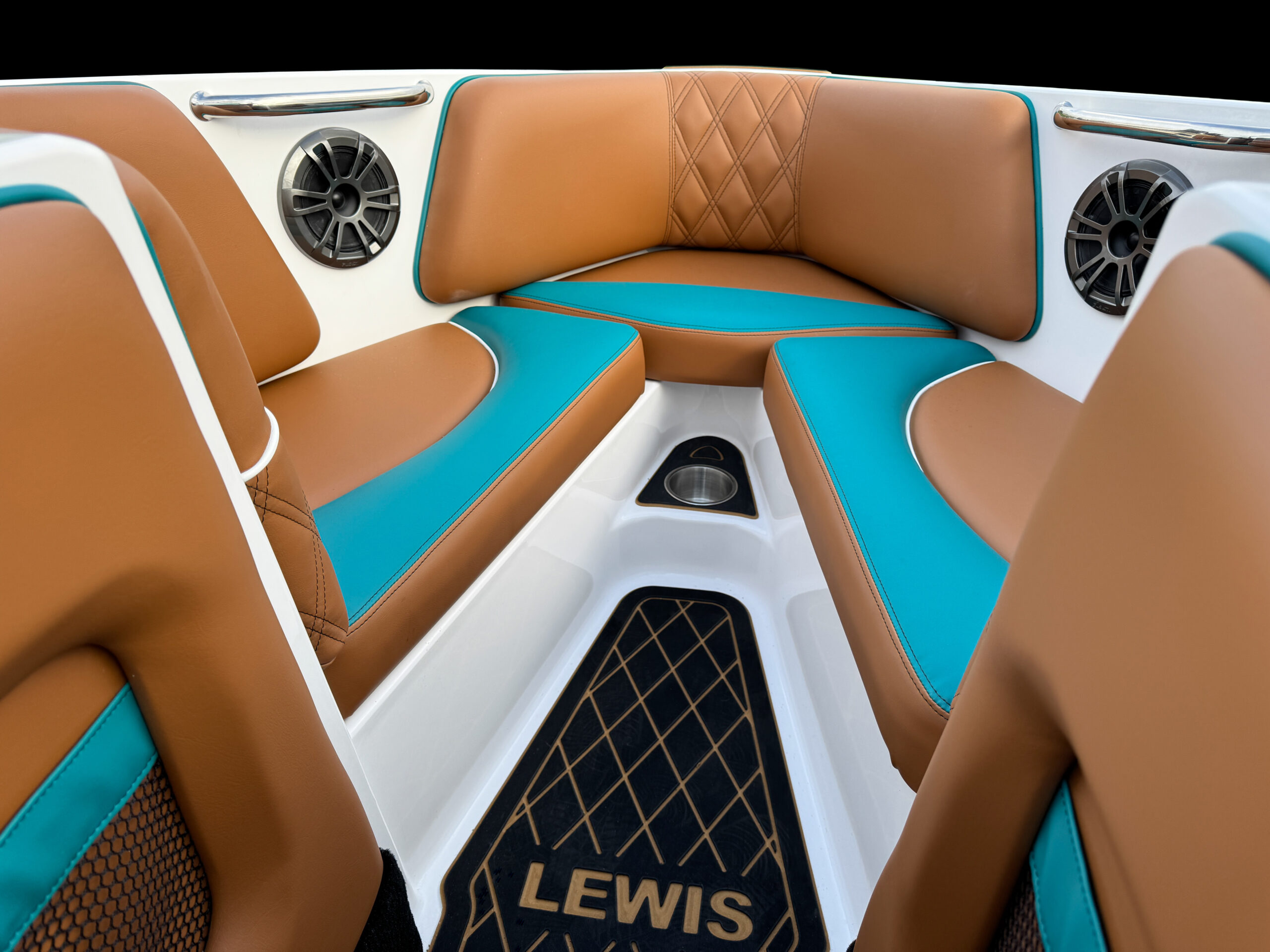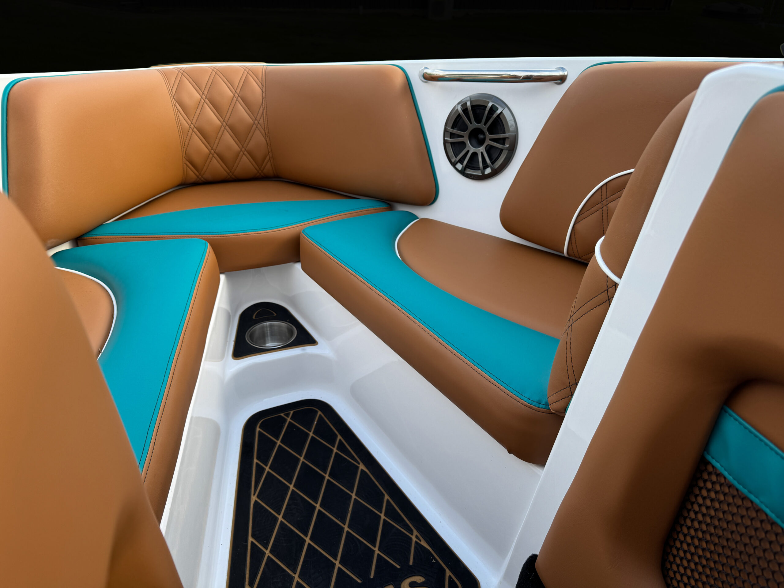 Designed to accommodate up to 10 passengers, it includes a large dual-opening rear ski locker, ample storage behind the observer seat, a side compartment with 4 stainless steel cup holders, plus an additional 7 cup holders distributed throughout. Entertainment is top-notch with 6 Fusion sports grille speakers driven by a Roswell AM/FM/Bluetooth waterproof head unit. A centre ski pole adds to its all-around tow capabilities.